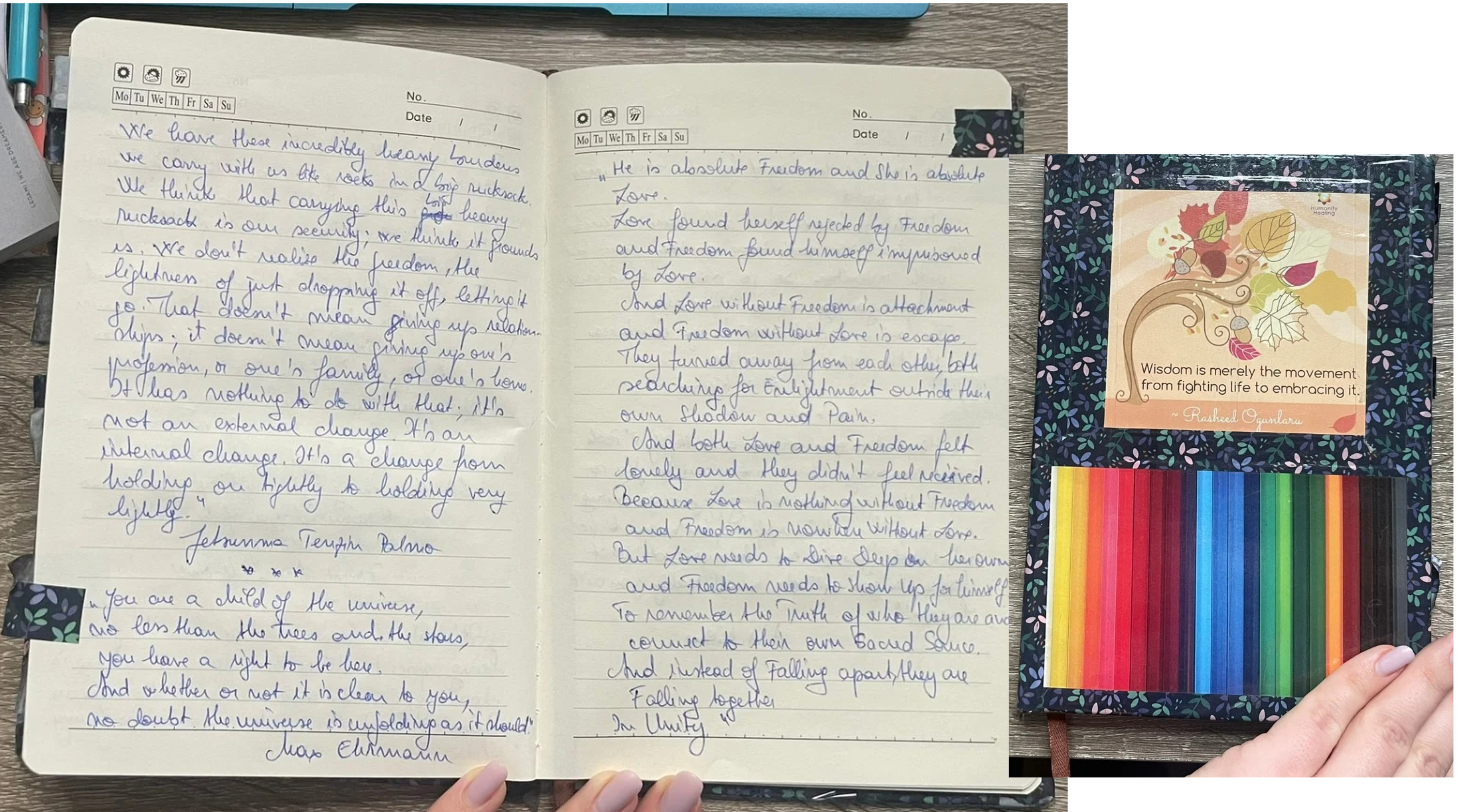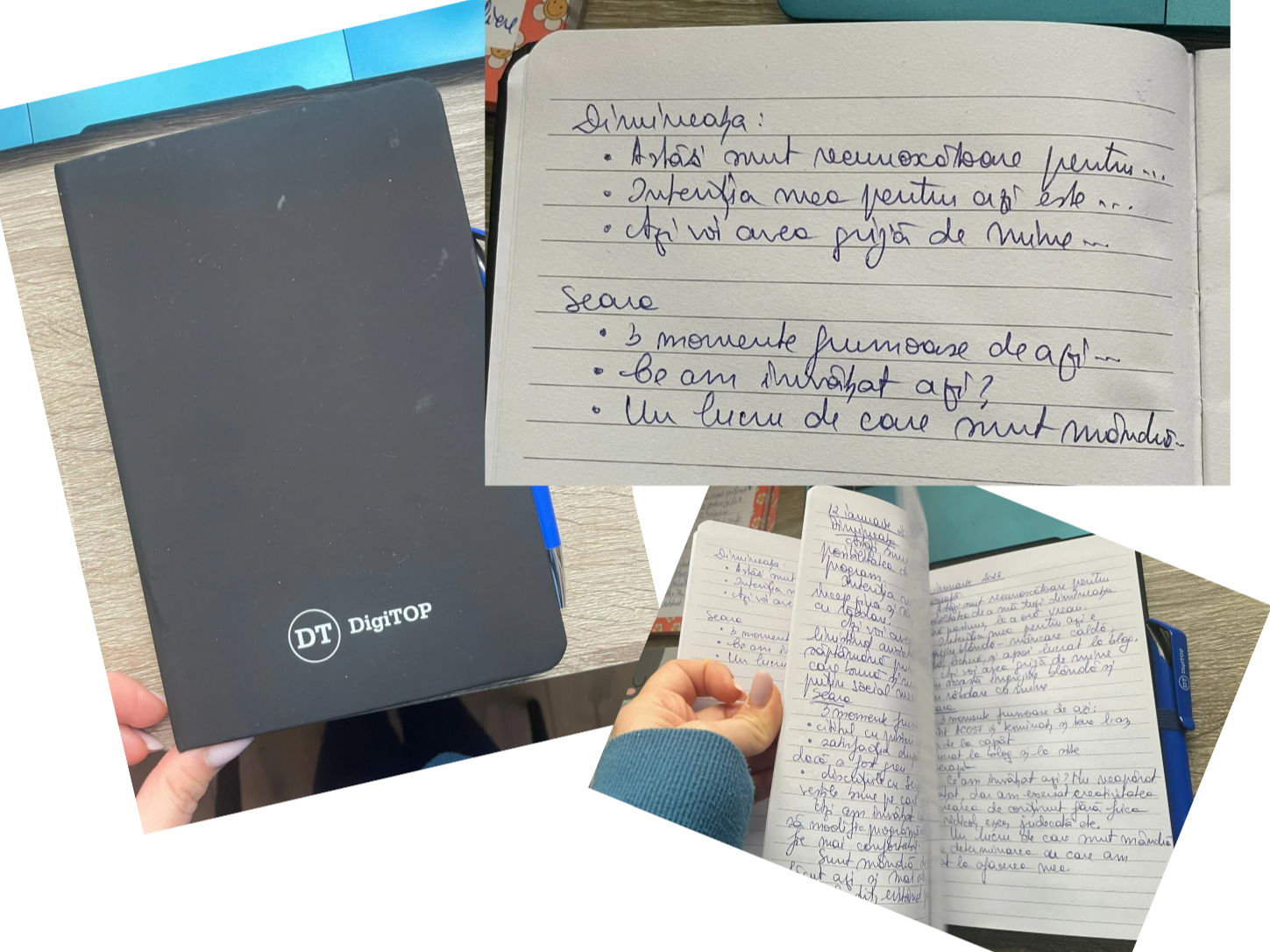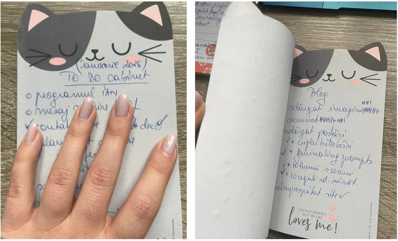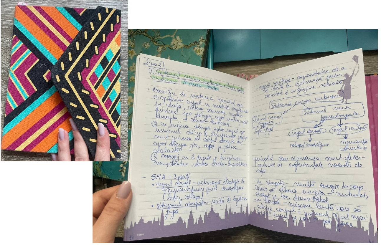 Cred că dacă ar fi să caut atent aș mai găsi măcar 1-2 caiete. E ceea ce mă ajută, îmi dă confort, stabilitate, posibilitatea de a mă exprima autentic. Simt că, prin scrisul constant, port un dialog eu cu mine, și reușesc să fiu mult mai atentă la nevoile mele, la ritmurile mele, la ce mă susține și ce mă consumă.