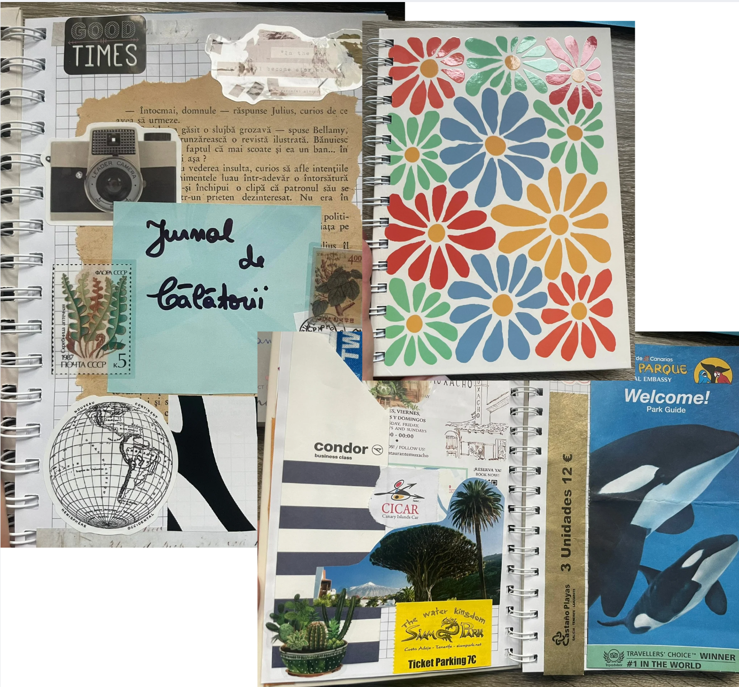 4 Jurnalul de călătorie - Îmi place să adun din călătorii mici amintiri: pliante de pe la muzee, bilelte de avion, brățări de intrare, poate câte o frunză sau floare uscată. Înainte le lipeam în jurnalul personal, și aveam pagini întregi de amintiri. Dar mi se pare că e prea intim jurnalul, prea scriu în el despre emoțiile mele, ca să îl amestec cu un caiet de amintiri. Așa că anul trecut am creat jurnalul de călătorie, într-un caiet simplu cu spirală, cred că tot de prin Auchan cumpărat.