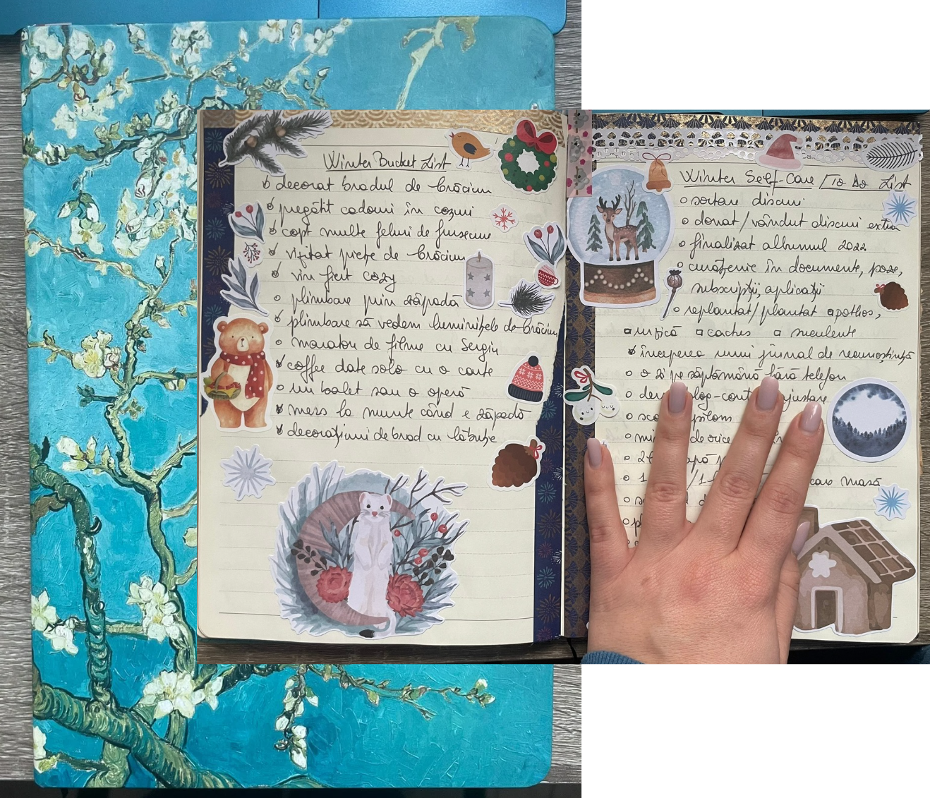 1 Jurnalul meu - E locul în care îmi scriu gândurile, îmi analizez trăirile, îmi descâlcesc planurile, și periodic răspund la întrebări precum cele pe care le-am tot publicat și aici în blog. Nu scriu zilnic, ci doar atunci când simt. Tot aici îmi creez și paginile cu „Bucket list” și „Self care list” despre care voi scrie mai pe larg într-o postare viitoare.